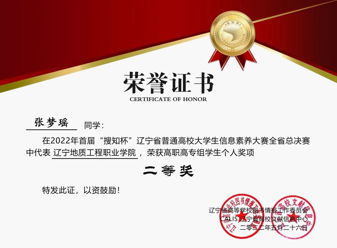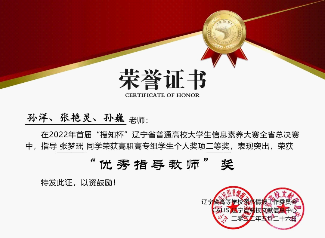 近日,2022年首届“搜知杯”辽宁省普通高校大学生信息素养大赛全省总决赛圆满落幕 天堂影视,学院环境与生态系张梦瑶获高职高专组学生个人二等奖,建筑系李兆祺获高职高专组学生个人优秀奖,孙洋,张艳灵,孙巍获“优秀指导教师”奖。